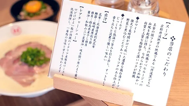フランス公認の優良品質を保証するラベルルージュの血統を受け継ぐ日本で唯一の丹波黒どりを使用して鶏ガラスープを仕込んでいます。また、風味をきかせるための和風のだしは、産地や品質にこだわり、コクのあるうまみを引き出しています。西中島南方駅から徒歩約2分、南方駅改札の目の前でラーメン店を営み、こだわりのスープで鶏白湯と鶏清湯を提供しています。野菜と煮込んでポタージュ風に仕上げた鶏白湯麺はイチオシのメニューです。トッピングとしてイタリア産の豚肩ロースのレアチャーシューやとろ玉もお選びいただけます。