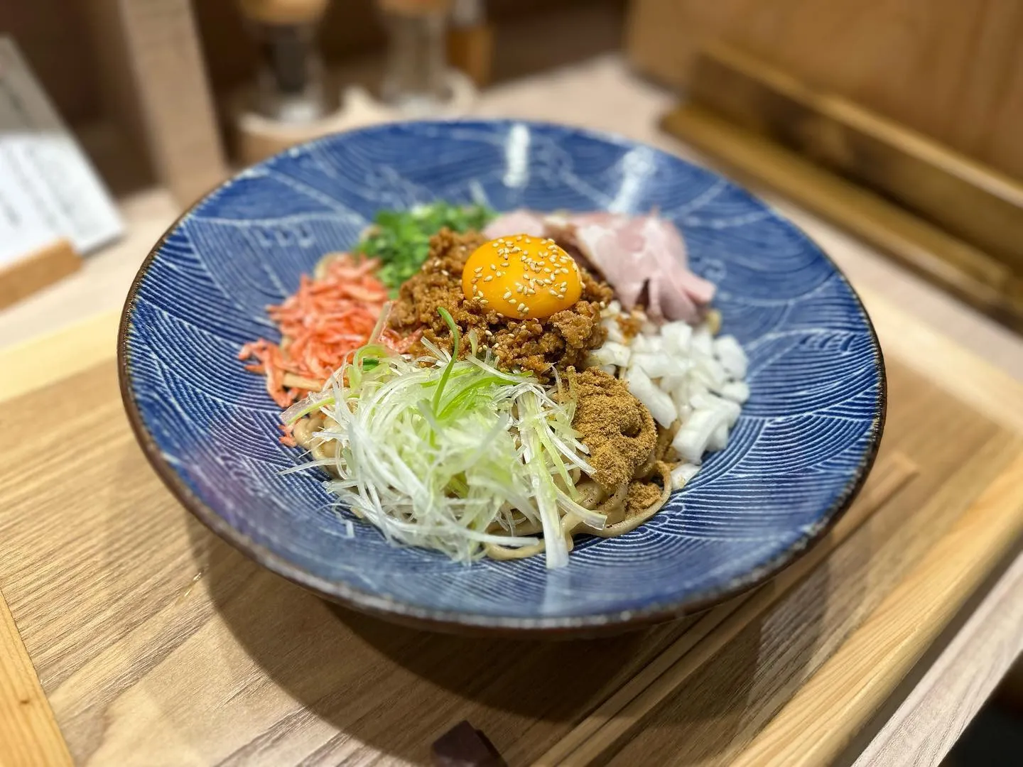 大好評頂いております当店のまぜそば。秘密のレシピで仕上げたミンチがドンと鎮座し、脇を固める主役級の味を持つトッピングたち。麺は特製のタレで絡めてあります。はっきり言って間違いなし!是非お試…